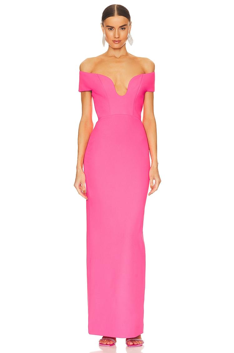This elegant column silhouette maxi dress in a vibrant matte pink features a fitted cut that enhances your figure. The off-shoulder neckline and wide strap sleeves add a sophisticated touch, while the sleeveless design keeps it sleek. Crafted from a polyester-elastane blend, it offers comfort with slight stretch and structure. The dress is completed with a hidden back zipper and a tasteful back vent slit, perfect for cocktail parties, semi-formal events, and formal occasions. Its timeless style and vibrant hue make it a standout choice for special evenings and celebrations.