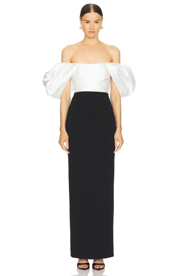 A striking color-blocked maxi dress features a sleek column silhouette with a fitted waist and a straight neckline that elegantly frames the shoulders. Crafted from matte black and white crepe polyester, its off-shoulder puff sleeves add a modern, sophisticated touch. The back reveals an open design with a subtle vent hem for ease of movement. Fully lined for comfort, this dress is perfect for formal occasions, cocktail parties, and elegant evening events, combining timeless style with contemporary flair.