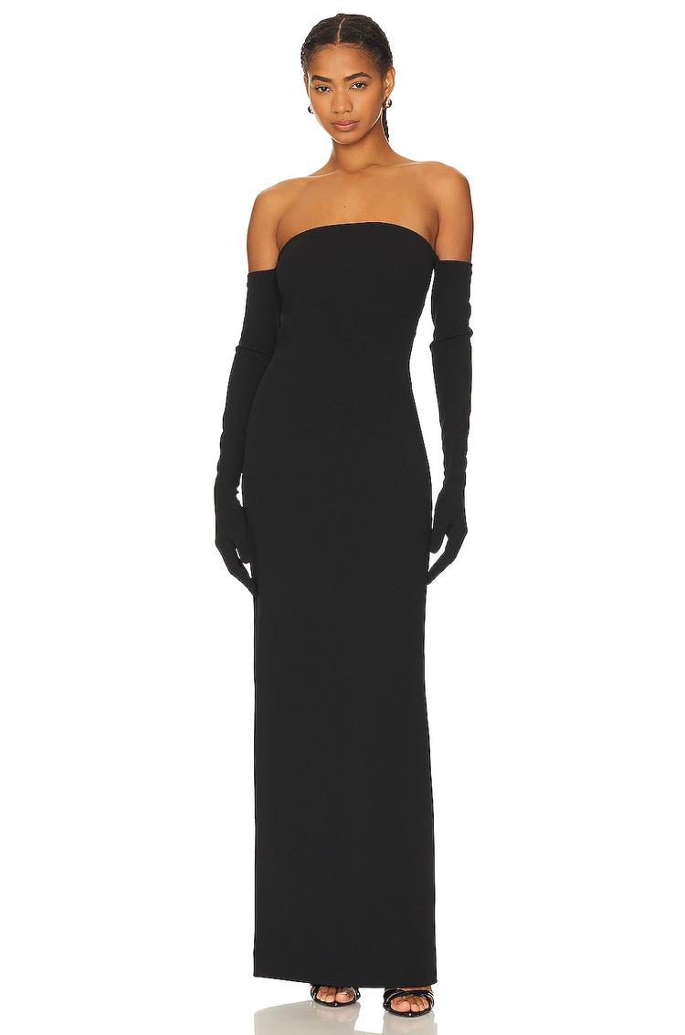 A sleek column silhouette in matte black crepe fabric defines this fitted maxi dress, featuring a straight, off-the-shoulder neckline that elegantly frames the shoulders. The sleeveless styling is complemented by attached gloves, adding a sophisticated edge. Concealed back zipper and a back vent enhance both fit and movement. Perfect for cocktail parties, formal events, or black tie optional occasions, this heavyweight polyester blend dress offers timeless elegance with non-slip silicone grip ensuring comfort and confidence all evening long.