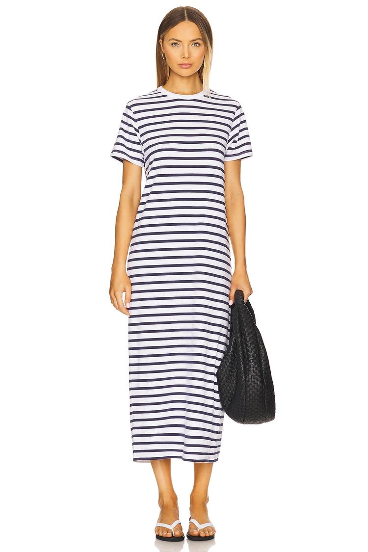 Classic and comfortable, this striped midi T-shirt dress features a relaxed regular fit crafted from a midweight cotton-elastane jersey blend. The crew neckline and half sleeves balance casual ease with a clean silhouette, while the back slit adds subtle movement and style. Its timeless striped pattern in blue and white lends a nautical-inspired vibe perfect for everyday wear, casual outings, or travel. Slip it on effortlessly for a minimalist yet chic look that transitions seamlessly across spring, summer, and autumn seasons.