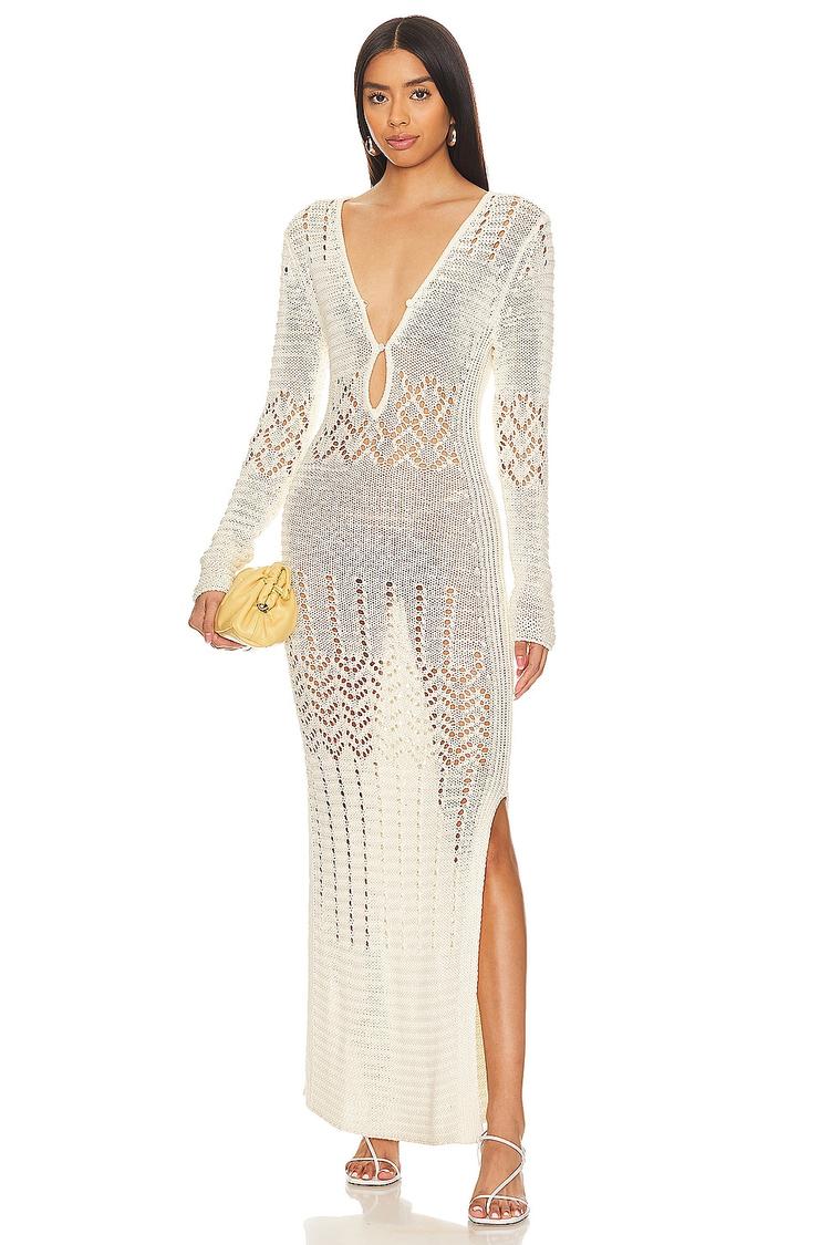 Delicate open crochet in mercerized cotton shapes a slim column silhouette with a deep neckline and long sleeves, culminating in a clean maxi hemline with a subtle side slit. The Lucinda Dress balances bohemian charm with casual chic elegance, making it perfect for spring and summer occasions like beach days, vacation escapes, brunches, and date nights. The partial front loop button closure adds a gentle vintage touch while the breathable midweight fabric offers comfort and style in warmer weather.