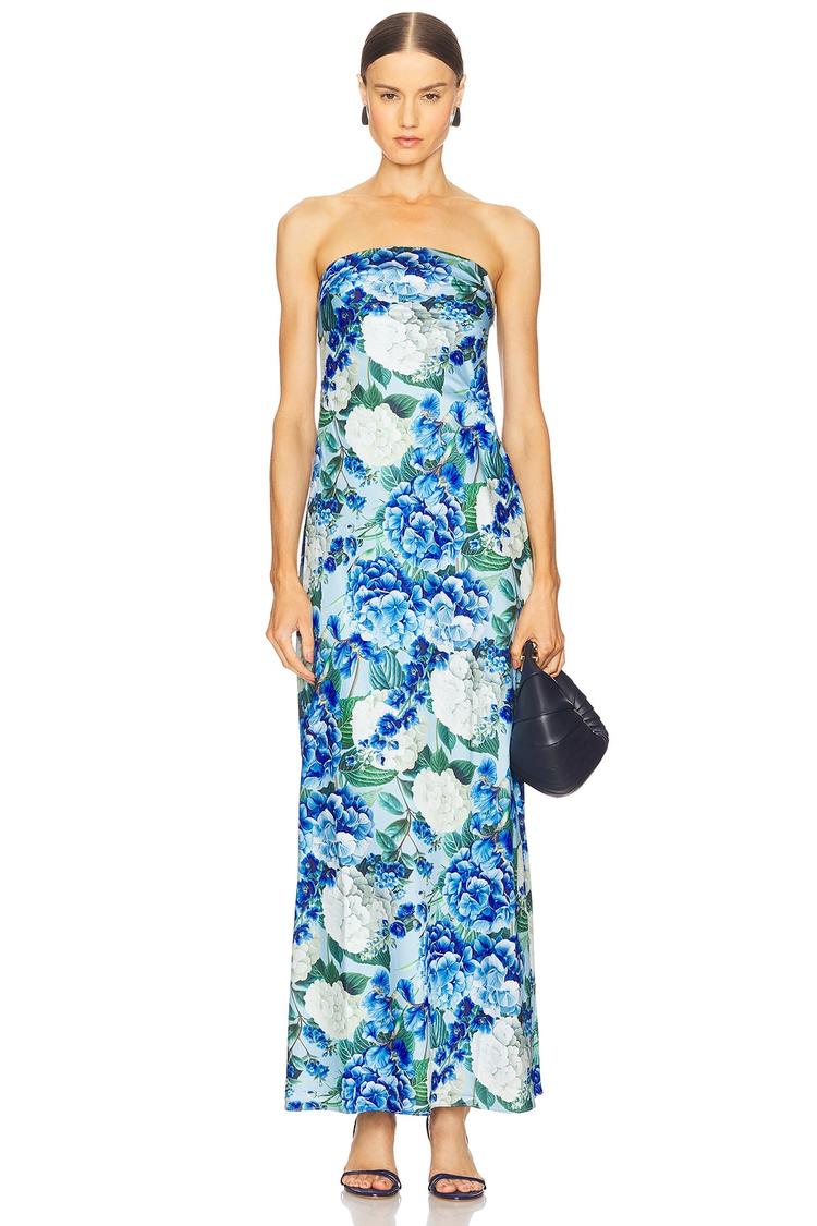 Soft floral satin fabric and a streamlined slip silhouette create a graceful maxi dress that drapes beautifully from a straight strapless neckline. The elasticized neckline and concealed side zipper ensure a comfortable, close fit while the fully lined construction adds subtle luxury. This elegant and minimalist dress in fresh blue, green, and white florals suits spring and summer occasions including cocktail parties, date nights, and evening outings, offering timeless style with modern ease.