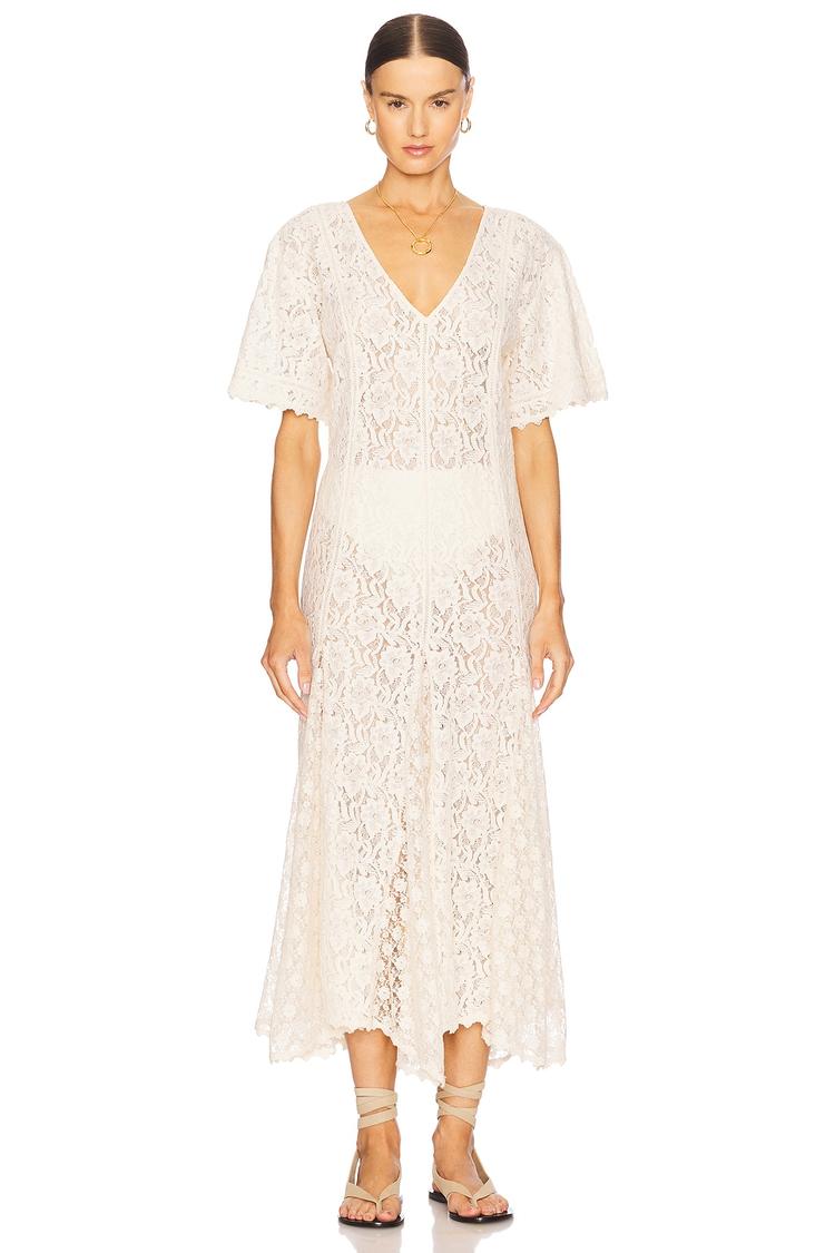 Delicate guipure lace fabric shapes a flowing A-line silhouette with a flattering V-neck and flutter half sleeves. The midi-length handkerchief hem adds romantic movement, while the slip-on design enhances ease. This off-white lace dress is sheer and unlined, perfect for layering over your favorite undergarments. Ideal for spring and summer brunches, date nights, or a dreamy vacation look, its elegant bohemian style offers a soft, ethereal vibe for versatile warm-weather occasions.