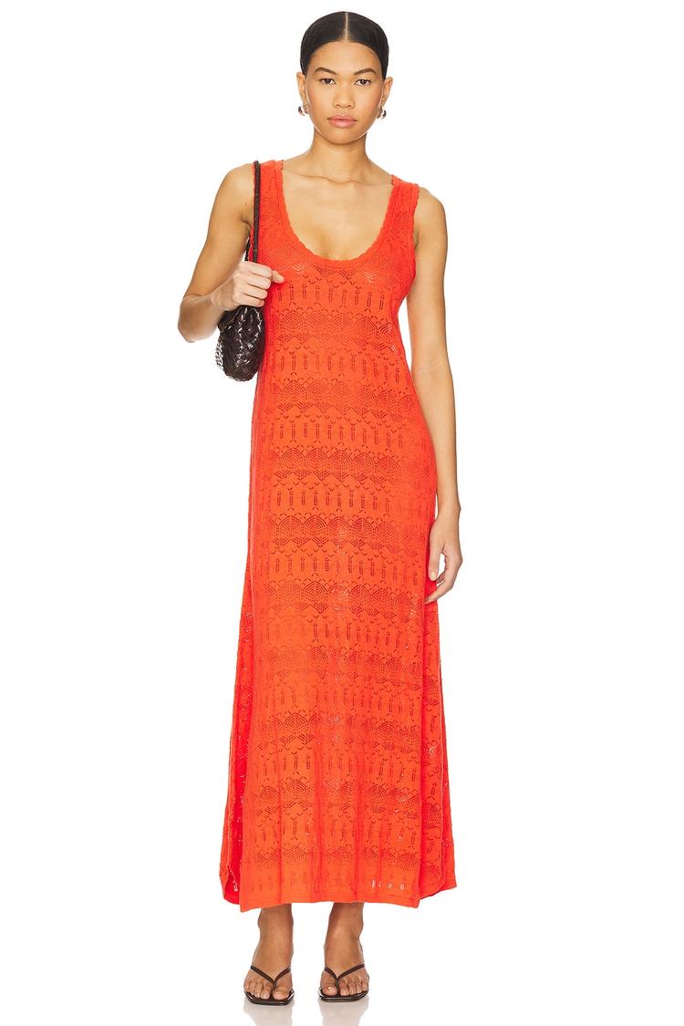 Delicate eyelet embroidery in vibrant matte orange covers this flowy column maxi dress, crafted from a breathable blend of organic cotton and linen. Featuring a sleeveless design with wide straps and a flattering U-neckline, it offers effortless slip-on comfort. The clean hemline and covered back complete the relaxed bohemian vibe, perfect for casual brunches, beach vacations, or sunny spring and summer days. Embrace easygoing style with a touch of artisanal texture in this versatile warm-weather essential.