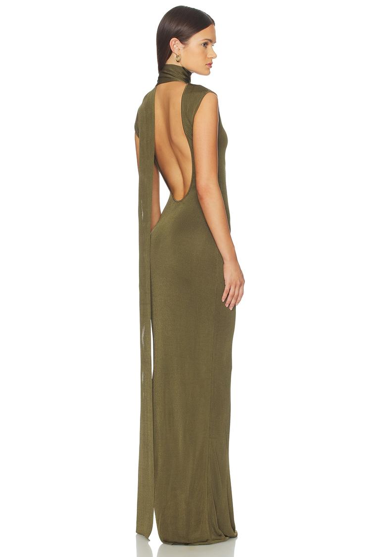 A sleek olive column silhouette with a high neckline and sleeveless wide straps defines this elegant maxi gown. Crafted from stretch mesh viscose fabric, it features a dramatic open back and delicate draping at the neck for refined sophistication. The slim fit skims the body gracefully, making it an ideal choice for cocktail parties, formal events, and romantic date nights. Its pull-on slip-on styling ensures comfort and ease, while the clean hemline adds to the gown’s modern, polished appeal.
