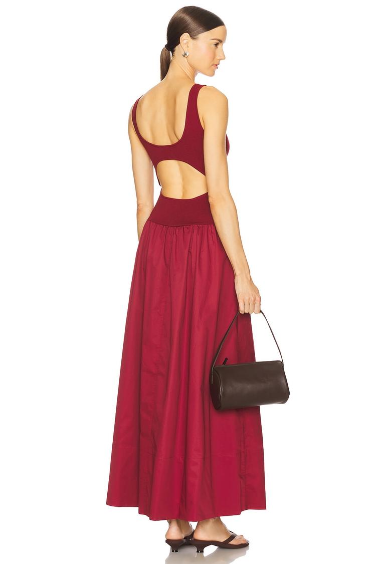 A matte burgundy maxi dress showcases a fitted bodice with a classic bateau neckline and wide straps, flowing into a voluminous poplin skirt. The standout open back cut-out adds modern allure, while side pockets enhance practicality. Crafted from a midweight blend of viscose, recycled polyester, and cotton jersey, this piece balances comfort and style effortlessly. Ideal for casual outings, brunch dates, or relaxed evening events, its minimalist silhouette and breathable fabric make it a versatile wardrobe staple for spring through autumn.