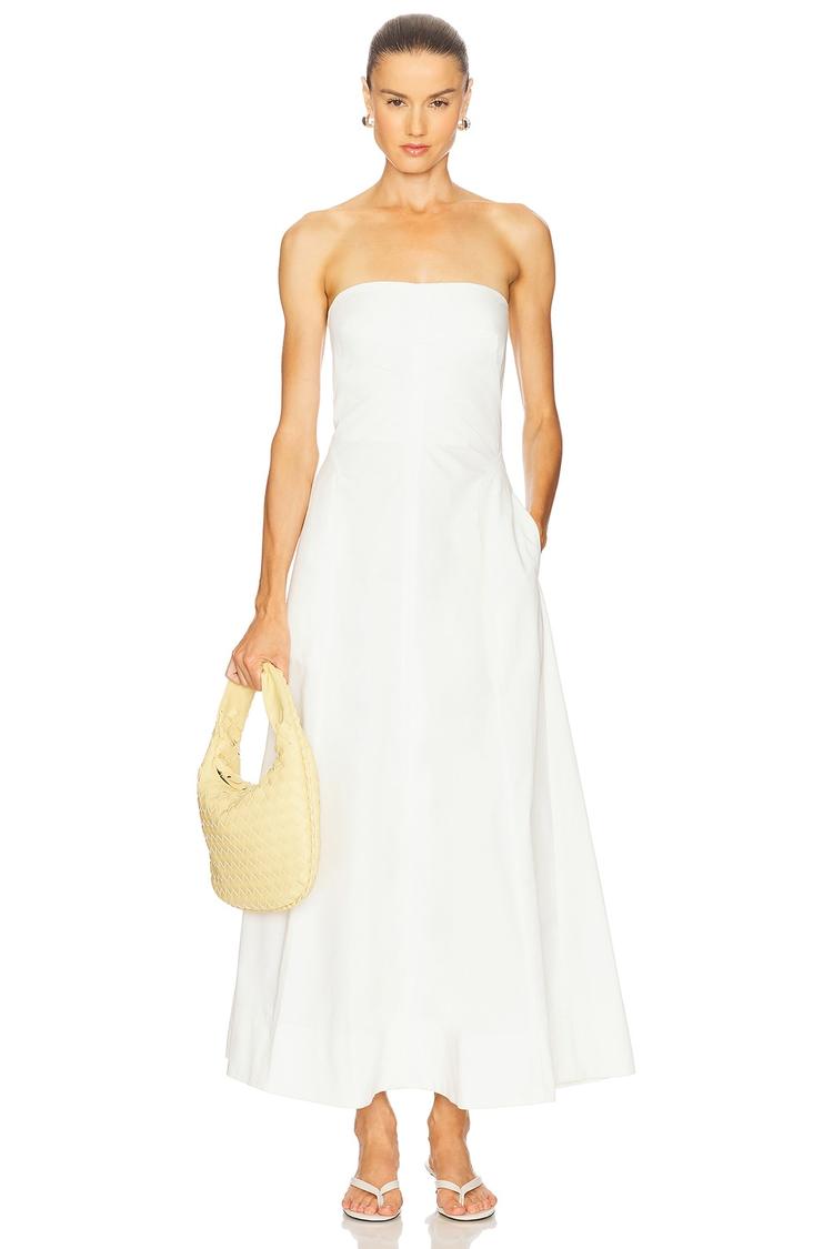 Soft organic cotton poplin shapes a sculpted column silhouette in this strapless midi dress. With a fitted bodice, concealed back zipper, and clean hemline, it combines minimalist elegance with subtle functional side seam pockets. The pure white hue and sleeveless design make it an ideal choice for spring and summer occasions, from casual brunches to vacation days and refined workwear settings. Its versatile simplicity allows effortless styling for both day and evening events.