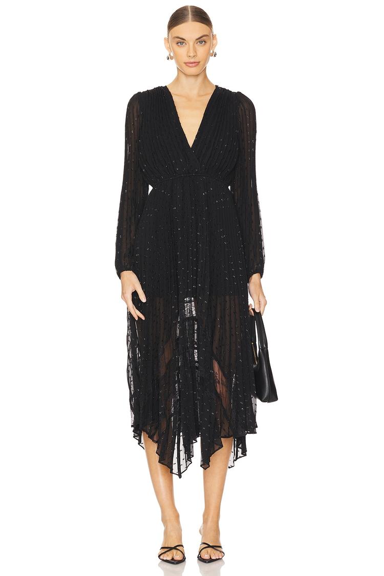 A flowing black georgette shift dress with delicate pleats and an asymmetric kerchief hem trimmed in lace creates a graceful silhouette. The V-neckline and long sleeves with elasticized cuffs add a refined touch, while the elastic waistband ensures a comfortable fit. Partially lined for modesty, this midi dress embodies effortless sophistication. Perfect for cocktail parties, date nights, or evening outings, it offers versatile elegance and a flattering shape that suits all seasons.