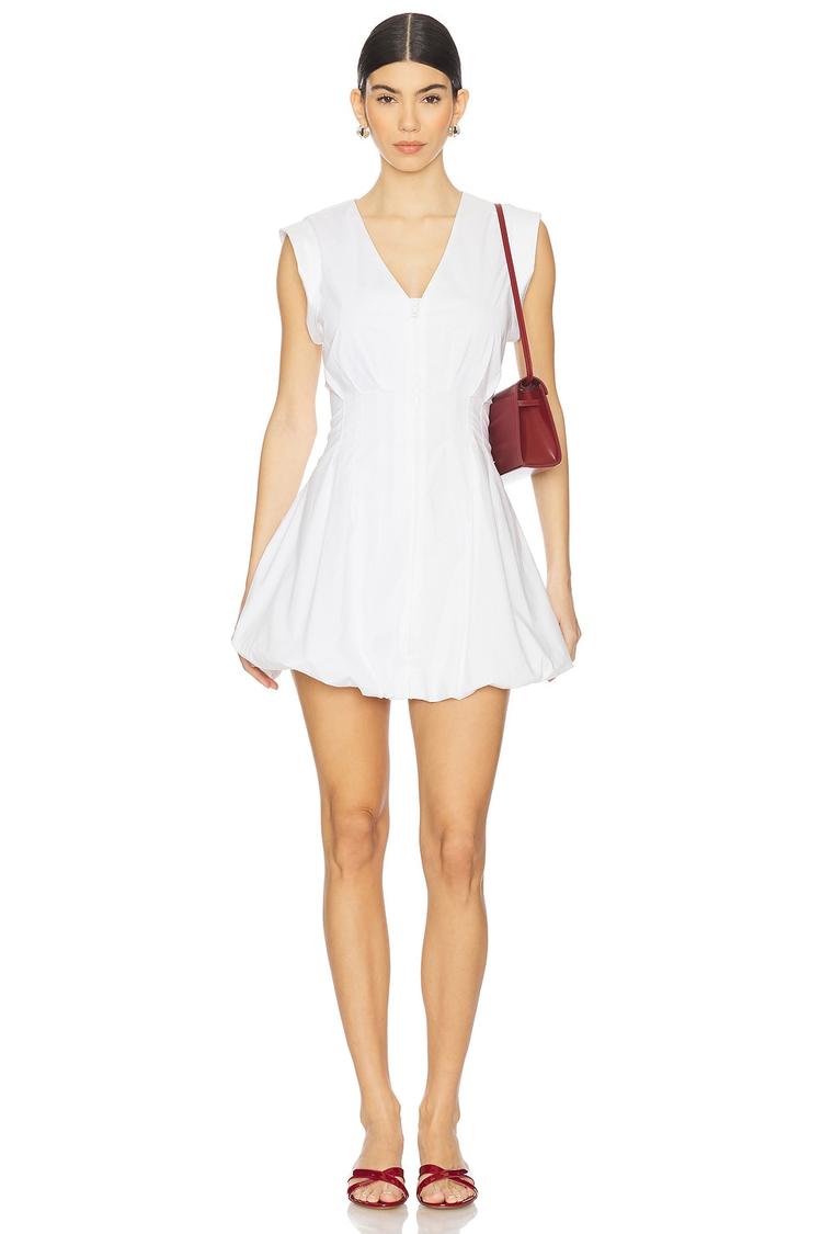 Soft white cotton with a hint of elastane shapes the Gale Dress into a flattering fit and flare silhouette. Featuring a deep V-neck and wide straps, this sleeveless mini dress boasts a playful bubble hem and side seam pockets for casual ease. The midweight poplin fabric and tailored darting at the waist create a polished yet comfortable look ideal for spring and summer brunches, casual dates, or daytime outings. Fully lined with a front zipper closure, it blends classic style with modern functionality for versatile, everyday chic.