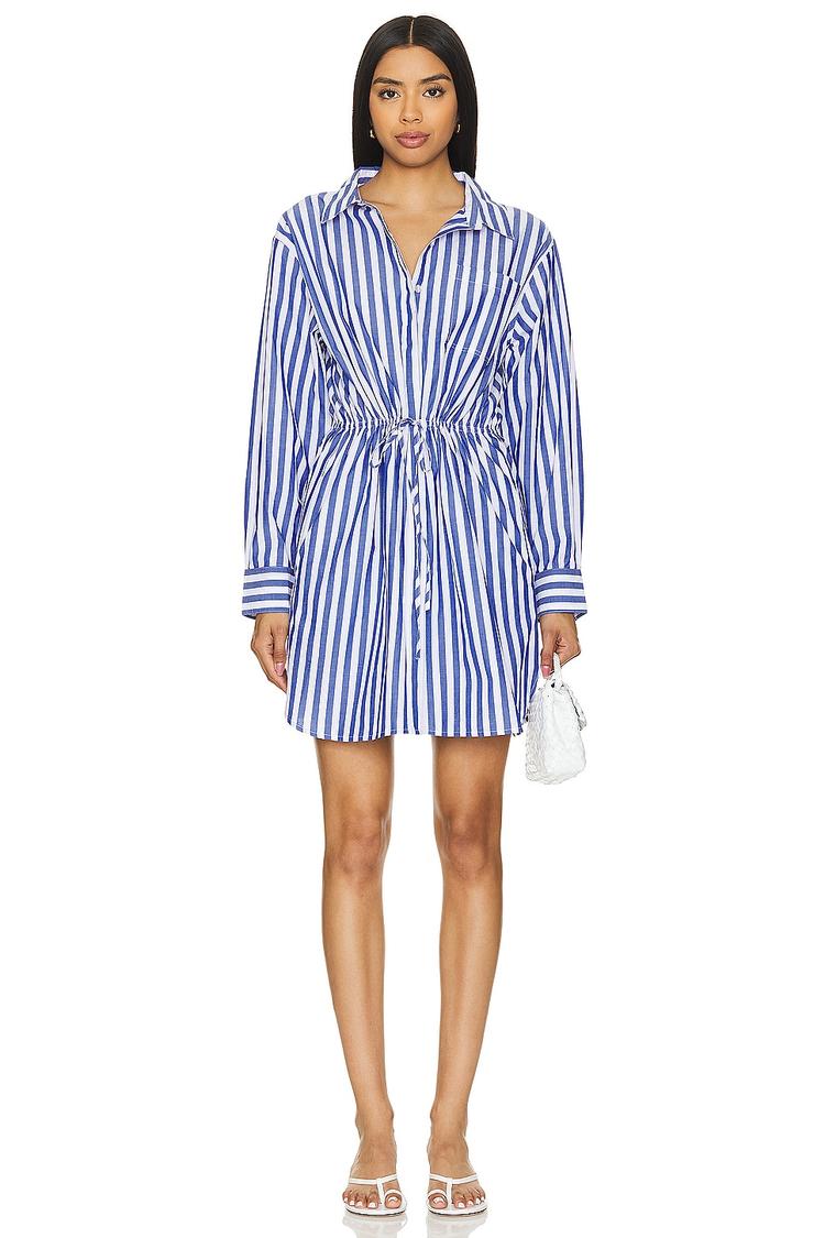 Blue and white vertical stripes define this classic shirt dress crafted from crisp poplin fabric. Featuring a collared neckline and long cuffed sleeves, it boasts a mini length with a clean hemline and a drawstring waist tie for an adjustable fit. The front button closure and breast tab pocket add practical charm, while subtle bow details enhance the casual chic vibe. Ideal for spring and summer brunches, casual workwear, or relaxed weekend outings, this versatile shirt dress balances comfort and style effortlessly.