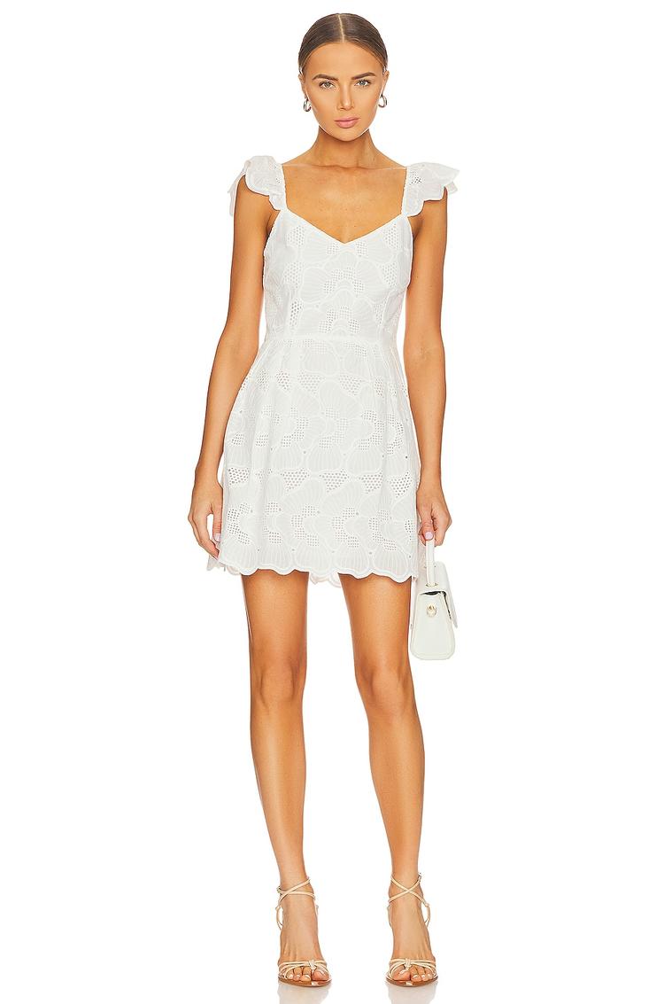 Delicate eyelet embroidery and ruffled flutter sleeves bring a romantic charm to this white mini dress. Crafted in lightweight cotton with a fully lined interior, it features a sweetheart neckline and an invisible back zipper for a smooth fit. The ruffled scalloped hem adds playful movement, perfect for spring and summer occasions like casual outings, brunches, or date nights. This classic A-line silhouette balances cute and timeless style with breathable comfort for warm weather wear.