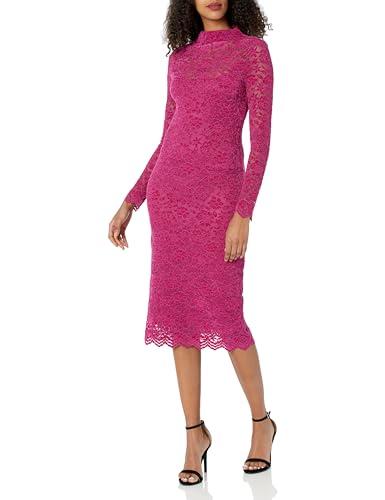 A striking matte fuchsia lace sheath dress featuring a high neckline and long sleeves offers a fitted silhouette that gracefully skims the body. The midi length with scalloped hemline adds timeless elegance, perfect for cocktail parties, semi-formal events, or date nights. Crafted from delicate lace fabric, this dress blends sophisticated style with classic charm, making it a versatile choice for any season.