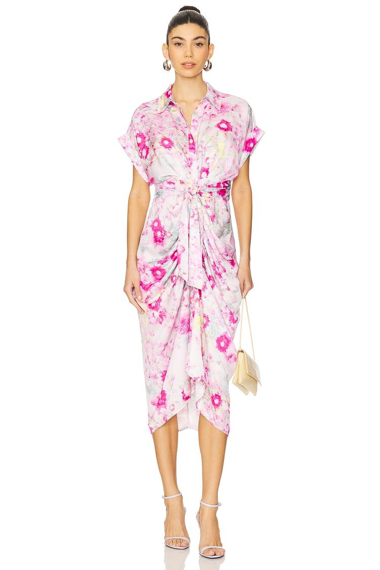 Soft matte white satin sets the stage for this elegant midi shirt dress adorned with a delicate all-over pink floral print. The classic collared neckline and cuffed short sleeves offer a polished silhouette, while gentle ruching and an attached waist tie enhance the adjustable fit for a flattering shape. Ideal for spring and summer, this versatile dress transitions seamlessly from brunch gatherings to cocktail events and date nights, combining timeless style with comfortable midweight fabric.