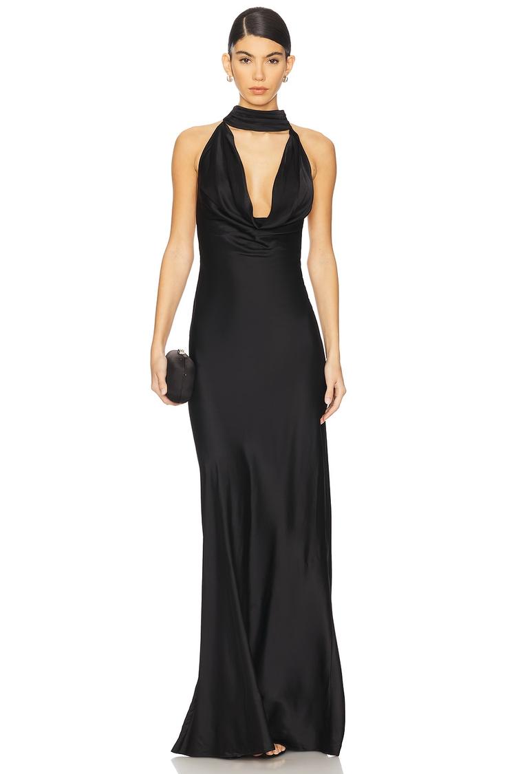 A sleek column silhouette crafted from lightweight charmeuse fabric offers a fitted and flowing maxi length gown with a halter neck and an elegant attached scarf detail. The open back and concealed zipper closure enhance its sophisticated appeal, making it a perfect choice for cocktail parties, formal evenings, and date nights. The matte black hue adds timeless elegance, while the sleeveless design ensures comfort and style across all seasons.