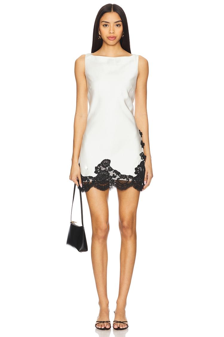 Soft matte white polyester forms a sleek mini shift dress with a slim fit and classic boat neckline. Sleeveless styling complements the clean hemline, while striking black lace embroidery graces the skirt hem, adding elegant contrast and intricate detail. A hidden back zip with hook and eye closures ensures a smooth silhouette. Perfect for cocktail parties, date nights, or nights out, this versatile dress blends timeless chic with modern grace for all-season wear.