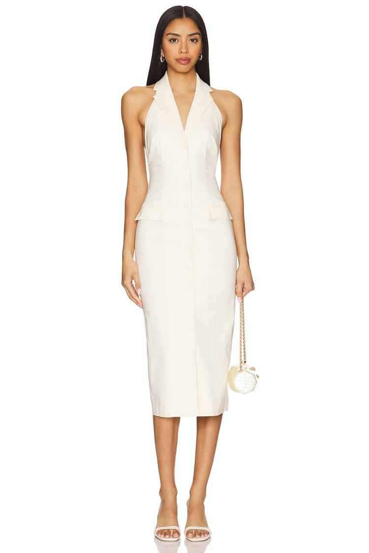 A sleek, cream midi sheath dress crafted in midweight taffeta blends polyester and viscose for a comfortable yet refined fit. Featuring a plunging V-neckline and sleeveless silhouette, it embraces a fitted shape that highlights the waist. The open back adds an alluring touch, complemented by a front button closure and discreet back zip. Faux slip pockets enhance its modern elegance, making it a sophisticated choice for date nights, cocktail events, or a stylish night out.