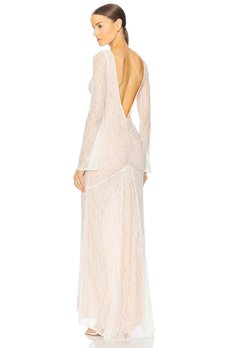 Delicate lace fabric drapes elegantly in this fitted column gown, featuring a timeless cream hue and a dramatic plunging V-back neckline. The maxi length is complemented by a subtle high-low hemline, adding graceful movement to the silhouette. Long sleeves and a round neckline create a balanced, sophisticated look. Partially lined for comfort and ease, this slip-on gown is perfect for formal occasions, cocktail parties, and romantic date nights. Its elegant design and luxurious texture make it a standout piece for special events across all seasons.