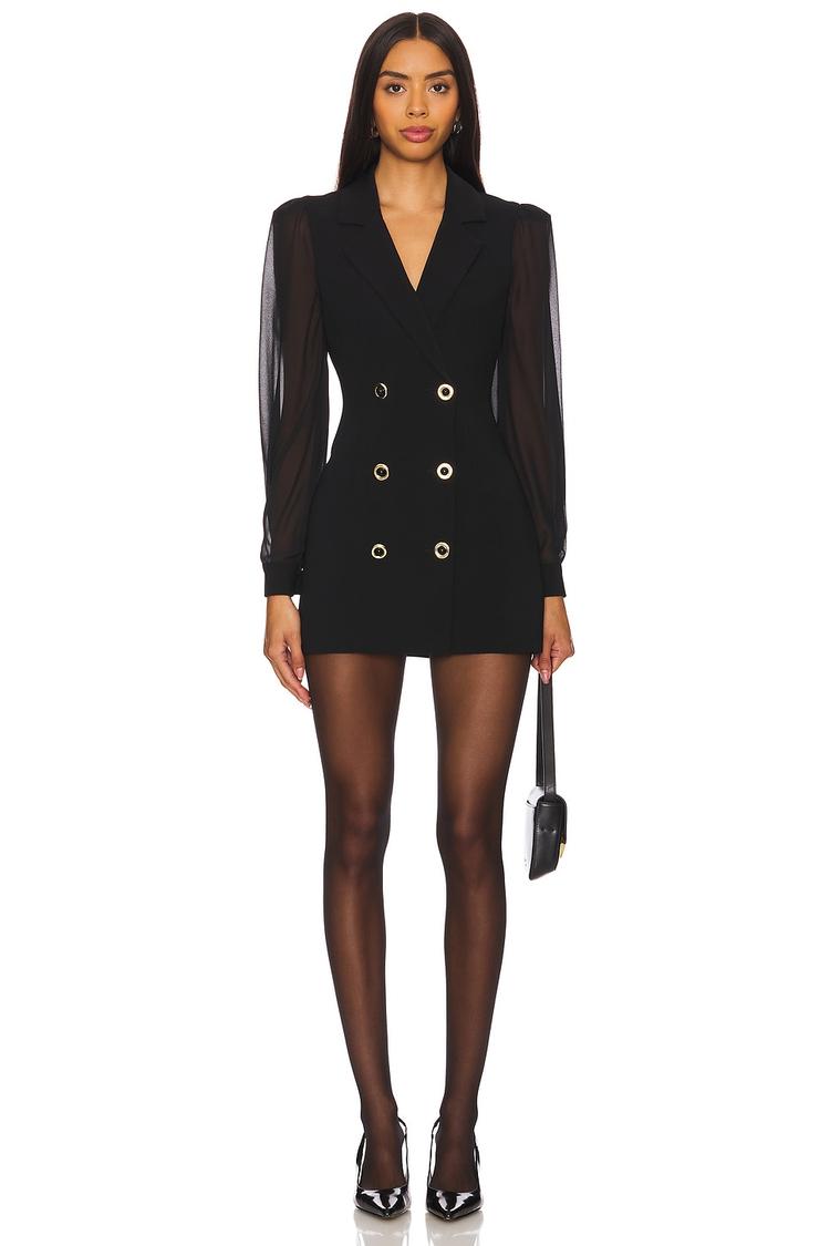 Bold and modern, this matte black blazer dress features a sleek mini length and fitted silhouette that highlights the body. Crafted from heavyweight crepe fabric with a luxurious polyester-elastane blend, it offers both structure and stretch. The double-breasted gold buttons add a sophisticated touch to the front, complemented by sheer blouson long sleeves and classic lapels. Ideal for cocktail parties, stylish night outs, and date nights, this dress blends elegance with contemporary edge for a standout evening look.
