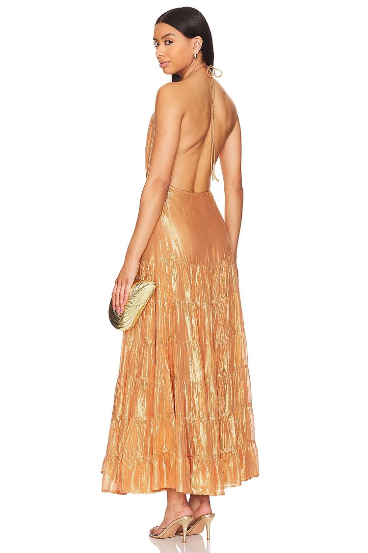 Shimmering peach hues and tiered ruffles create a graceful maxi silhouette with a flared fit that moves effortlessly. The halter neck and sleeveless design emphasize the elegant, open back secured with a tie closure, complemented by a detachable waist-tie belt that defines the waist. Crafted from a luxe blend of viscose, lurex, and rayon, this fully lined dress offers a sophisticated shimmer perfect for spring and summer occasions like cocktail parties, date nights, and weddings.