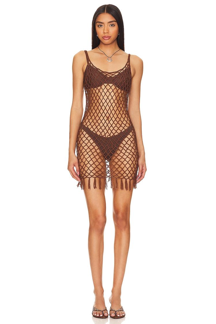 Open knit crochet fabric with a fringe hem creates a breezy and alluring mini cover-up dress in warm brown tones. The scoop neckline and spaghetti straps enhance its relaxed, easy fit, while the open back adds a flirtatious touch. Crafted from lightweight acrylic, it’s perfect for summer beach days, poolside lounging, or vacation getaways. The sheer silhouette pairs seamlessly with swimwear underneath, embodying cute and trendy vibes for effortless style on the go.