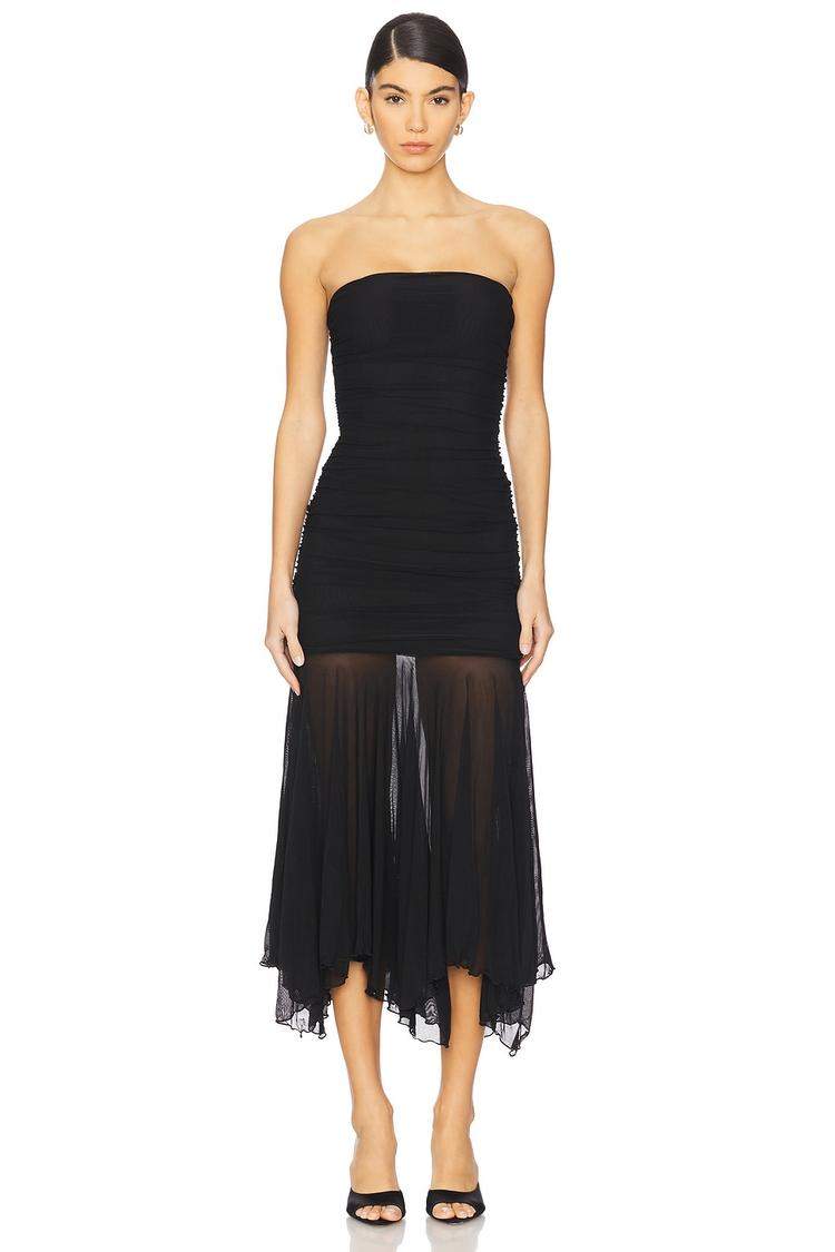 A sleek strapless sheath silhouette with ruched sides creates a flattering fitted look in this matte black midi dress. The asymmetric hemline adds modern flair while the lightweight mesh fabric brings airy sophistication, perfect for spring to autumn wear. Its pull-on styling and partial lining ensure comfort and ease. Ideal for date nights, cocktail parties, and night outs, this dress combines sexy and trendy elements with a contemporary edge for versatile evening elegance.