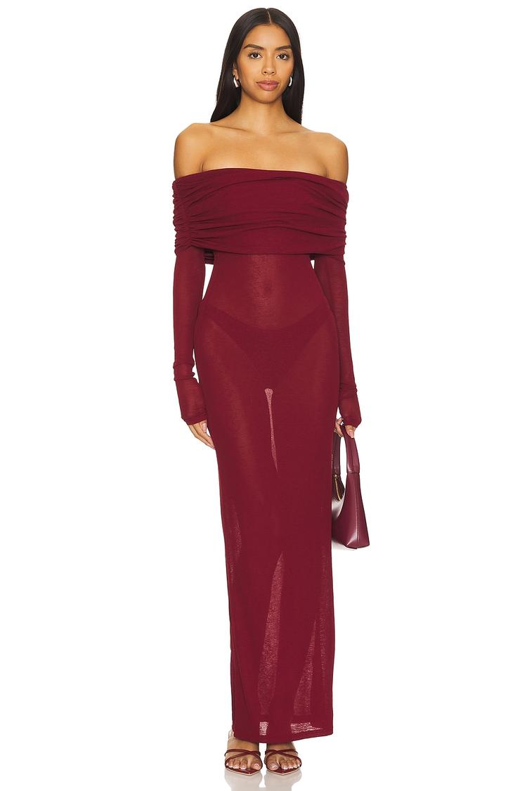 Softly embracing the silhouette, this burgundy column gown features a striking off-shoulder neckline paired with long sleeves for a sultry yet elegant look. Crafted from a smooth polyester-elastane blend, the dress offers a slim fit that flows gracefully into a maxi hem with a clean finish. Its sheer panels add a daring edge, making it ideal for cocktail parties, date nights, or night outs. The pull-on styling ensures easy wear, while the partially lined fabric provides subtle coverage without compromising allure.