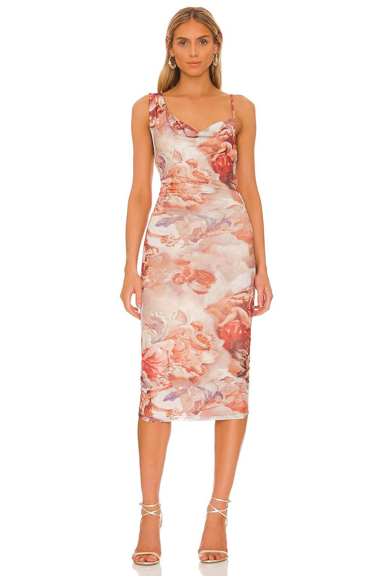 Subtle draping and an abstract dusty rose pattern create a captivating look in this bodycon midi slip dress. The adjustable spaghetti strap and open back add a modern, sexy edge while the mesh fabric overlay brings delicate texture to the matte off-white base. Perfectly fitted with a hidden side zipper, this fully lined dress shines for spring and summer cocktail parties, date nights, or stylish evenings out. Its versatile length and sleek silhouette make it a trendy choice for autumn events as well.