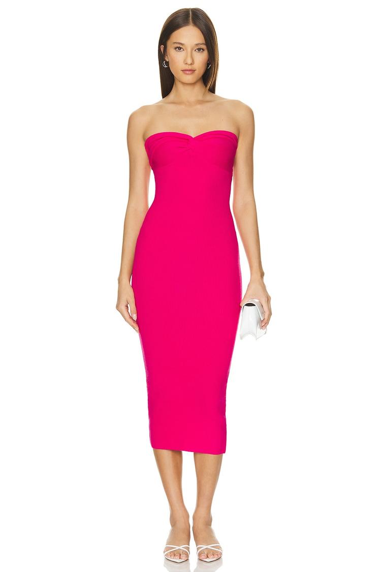 Bright pink ribbed knit fabric sculpts a sleek sheath silhouette in this strapless midi dress. The fitted design highlights curves while the open back with a chic cut-out detail adds a daring touch. Perfect for spring and summer evenings, it’s an ideal choice for date nights, cocktail parties, or a night out with friends. The pull-on styling ensures effortless wear, combining comfort with modern sophistication in one stylish package.