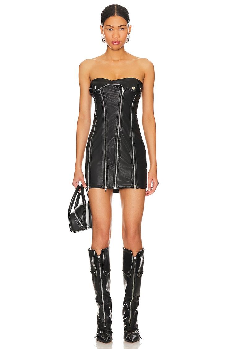 Sharp and edgy, this mini corset dress in matte black faux leather features a straight neckline and strapless sleeveless design that accentuates a bodycon fit. The clean hemline and front silver zipper detailing add bold moto-inspired flair, making it a perfect choice for a night out, cocktail parties, or date nights. Crafted from polyester-based faux leather, this versatile piece transitions seamlessly across seasons and pairs effortlessly with boots or stilettos for a statement-making look.