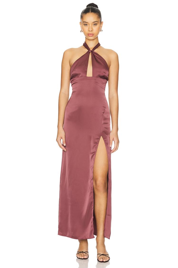 A sleek column silhouette in a dusty rose satin creates an effortlessly elegant look. The halter neck with tie-up closure and a discreet back zipper ensure a perfect fit, while the front cut-out and thigh-high slit add a sultry modern edge. Fully lined for comfort, this fitted maxi dress is ideal for cocktail parties, date nights, and sophisticated evening events during spring, summer, or autumn. The clean hemline and luxurious satin fabric enhance its refined appeal, making it a standout choice for those seeking a bold yet polished style.