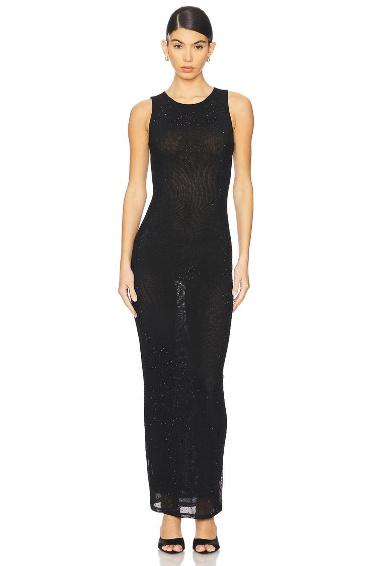 A sleek matte black column maxi dress adorned with shimmering rhinestones creates a captivating silhouette. The bodycon fit hugs curves with a modern round neckline and sleeveless wide straps, perfect for a confident night out. Crafted from a stretchy mesh blend of polyester and elastane, this semi-sheer dress features subtle sheer panels adding allure. Its pull-on styling ensures effortless wear. Ideal for cocktail parties, date nights, or stylish evening events, this dress embodies trendy sophistication with a hint of sexy charm.