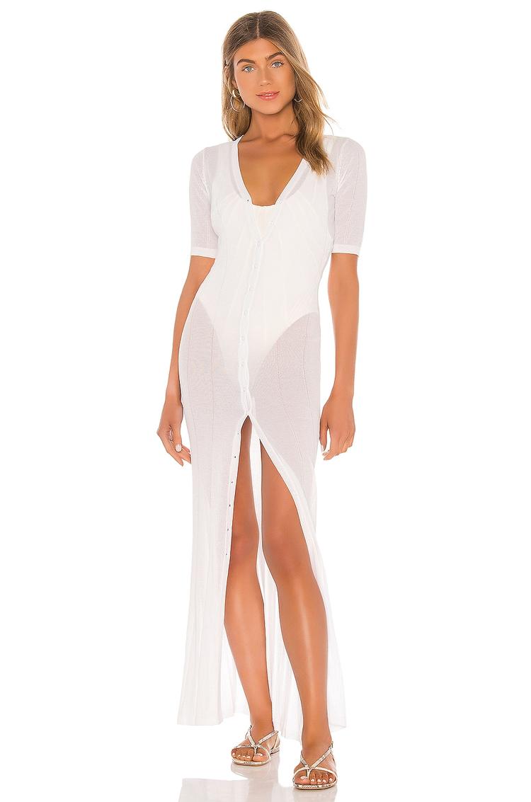 Soft, sheer fabric in a clean white hue highlights this slim-fitting maxi slip dress with a flattering U-neck and half sleeves. The front button closure and thigh-high slit add a subtle sexy appeal, while the viscose-nylon blend ensures lightweight comfort perfect for warm weather. Its minimalist and casual chic style makes it a versatile choice for beach days, vacation getaways, or stylish brunches and date nights. Effortlessly elegant with a hint of allure, this knit maxi dress is a standout piece for spring and summer wardrobes.