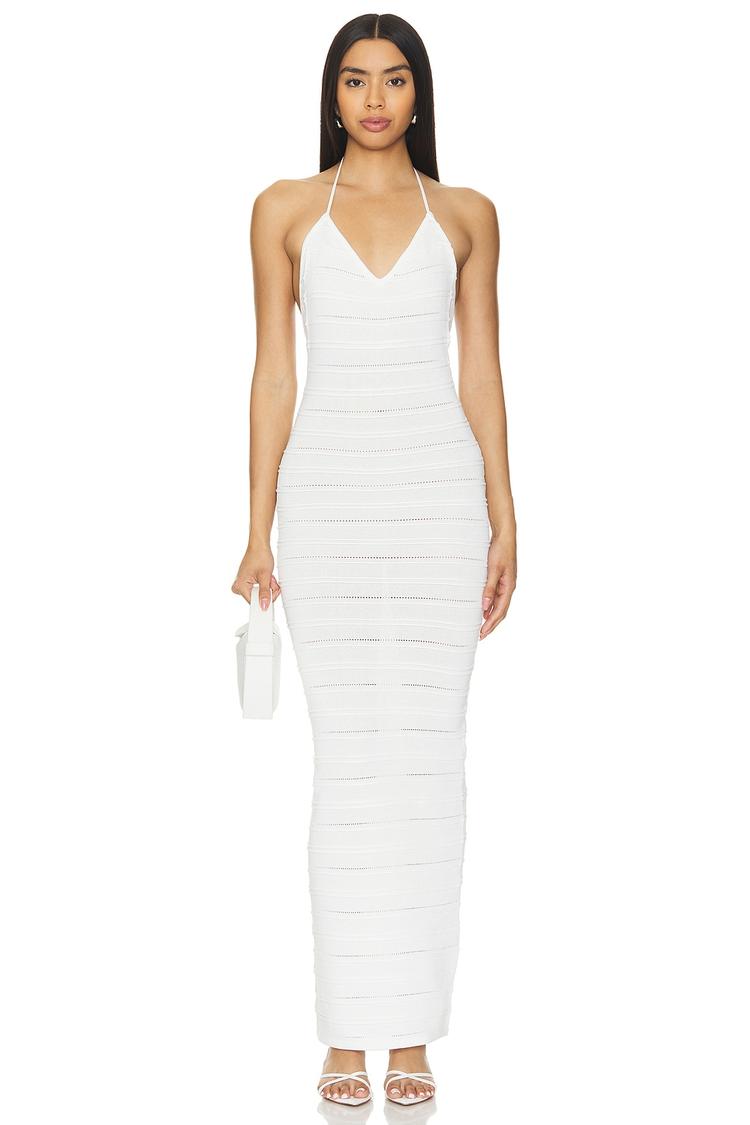 A sleek white slip dress crafted from a smooth knit blend of viscose and polyamide offers a figure-hugging bodycon fit that gracefully extends to a maxi length. The V-neckline and tie-up back closure add subtle allure, while the sleeveless, strapless styling keeps it cool and minimal. This modern silhouette with a clean hemline is ideal for cocktail parties, date nights, or stylish night outs during spring and summer seasons, combining effortless elegance with contemporary charm.