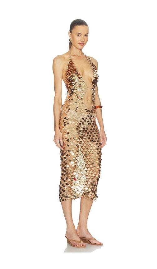SUPERDOWN DECLAN CROCHET MIDI DRESS IN METALLIC GOLD.