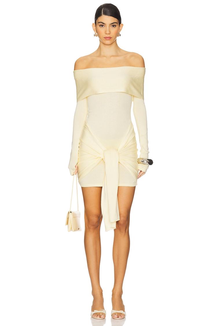 Soft matte cream viscose jersey sculpts a chic bodycon mini with a foldover off-shoulder neckline and long sleeves. The attached wrap detail at the waist adds a flirty ribbon accent to the sleek sheath silhouette, perfect for cocktail evenings, date nights, and stylish night outs. This pull-on dress combines modern sexy style with comfortable stretch fabric, making it a versatile choice for spring through autumn wear.