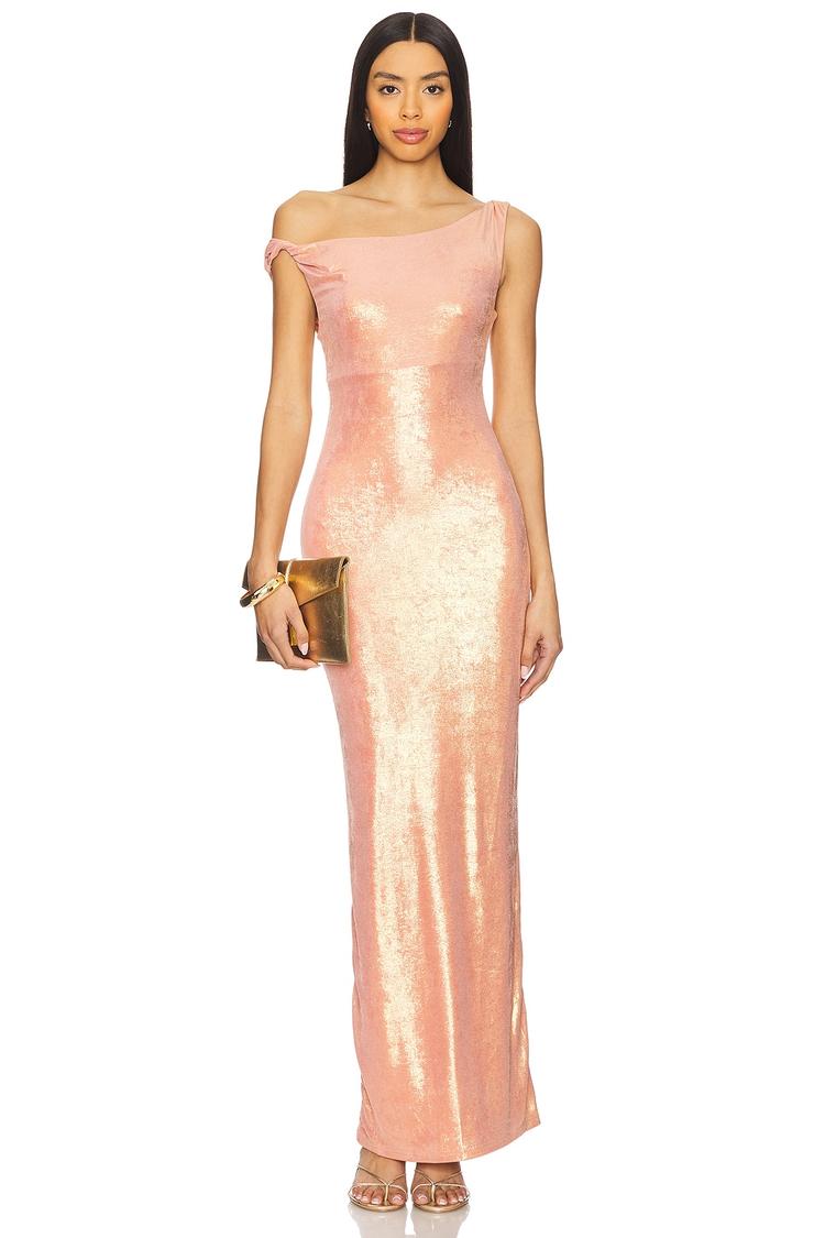 Soft shimmer peach hues and a sleek column silhouette create an elegant presence with this fully lined gown. The off-shoulder neckline paired with wide straps and sleeveless styling enhances its sophisticated charm, while the fitted shape and side vent offer graceful movement. Crafted from a slinky polyester-lurex blend with metallic threading, this maxi-length dress is perfect for cocktail events, formal occasions, or romantic date nights. Its clean hemline and pull-on style make it both stunning and comfortable for all-weather wear.