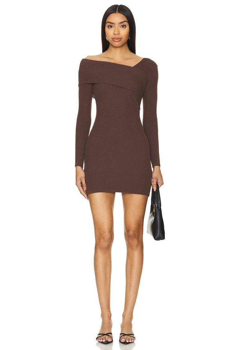 This fitted mini dress features a ribbed midweight knit fabric that hugs the silhouette elegantly. Its off-shoulder neckline and long sleeves offer a modern, minimalist look perfect for autumn, winter, and spring evenings. The clean hemline and sheath silhouette create a sleek profile, making it ideal for date nights, cocktail events, or stylish brunches. Crafted from a comfortable blend of viscose, nylon, and elastane, this slip-on dress combines stretch and structure for effortless wear and contemporary appeal.