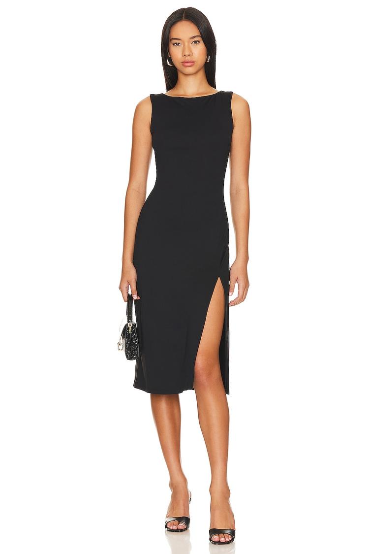 Sleek and sophisticated, this fitted sheath dress in matte black nylon-spandex jersey features a timeless round neckline and sleeveless wide straps for a clean, minimal silhouette. The midi length and side slit add an alluring touch, perfect for date nights, cocktail parties, or evenings out. Crafted with a midweight fabric for comfortable wear across all seasons, its slip-on style ensures effortless dressing. Classic yet sexy, this versatile piece is a chic essential for your refined wardrobe.