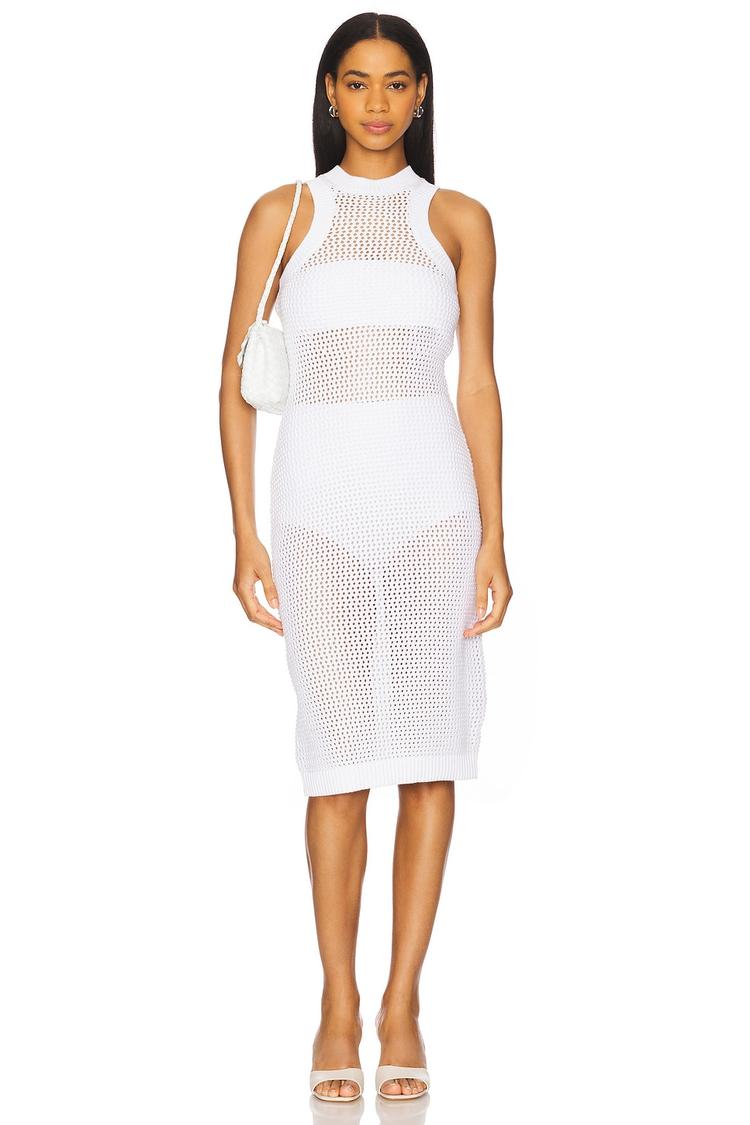 Open-knit cotton fabric and a sleek shift silhouette define this white midi dress, featuring a high neck and wide straps for a fresh, minimalist look. Its slim fit flatters the figure while the sheer knit adds subtle allure, perfect for warm spring and summer days. The pull-on style ensures easy wear, making it an ideal choice for casual outings, beach vacations, or relaxed brunches. Pair with simple accessories for a chic, effortless ensemble that embraces both comfort and style.