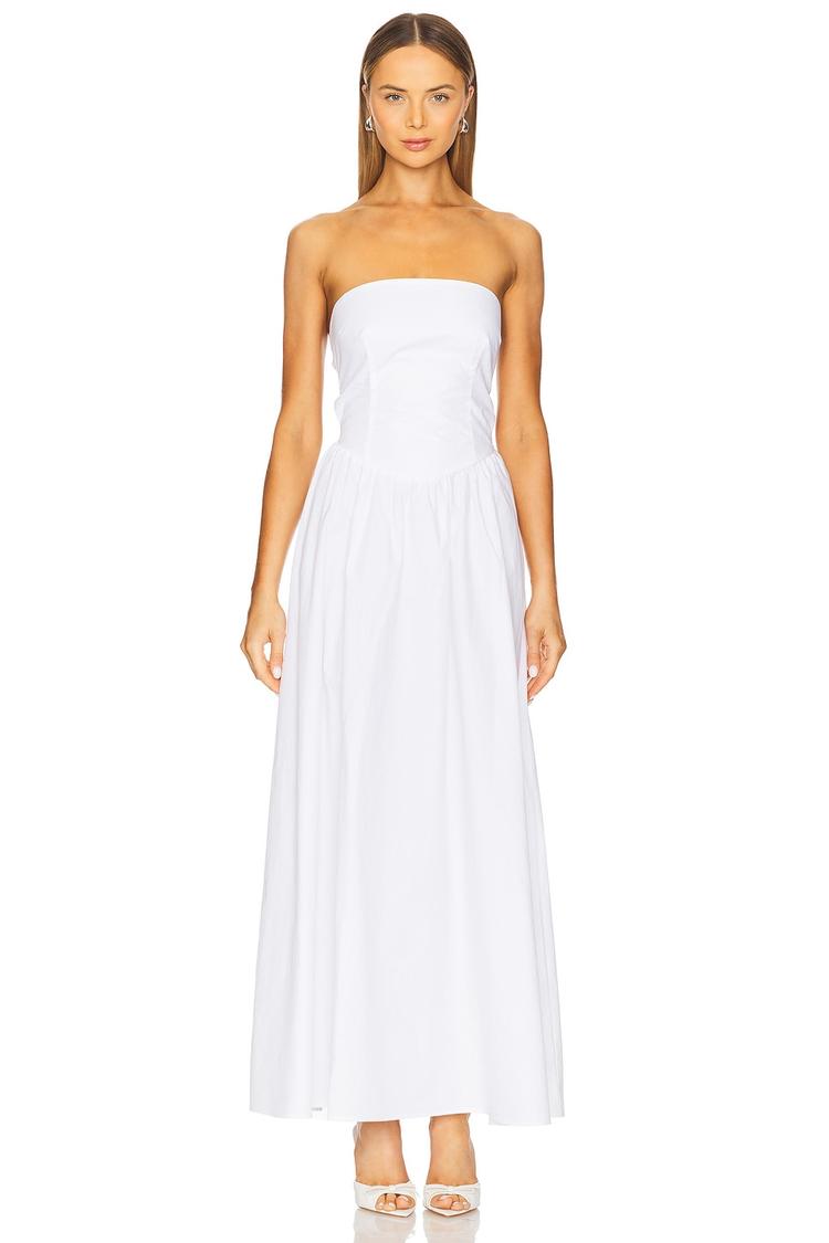 Soft cotton poplin shapes this strapless maxi dress with a relaxed A-line silhouette. The straight neckline and elastic shirred back provide comfortable pull-on styling, while the drop waist and clean hem add subtle modernity. Side seam pockets enhance everyday practicality. Ideal for spring and summer, this lightweight dress suits casual outings, beach vacations, and brunch dates with effortless chic.