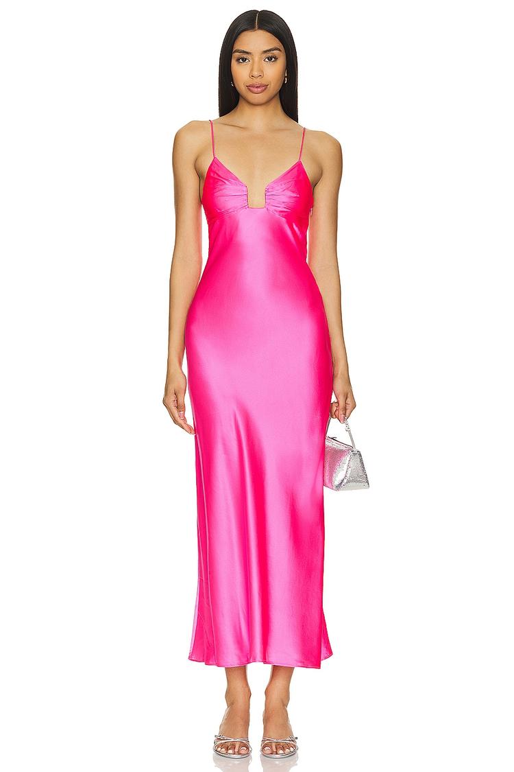 Shimmering fuchsia silk satin creates a sleek and sophisticated slip dress with a flattering slim fit and midi length. The V-neckline features wired support, while delicate spaghetti straps and a hidden side zipper closure complete the minimalist look. Its clean hemline and elegant silhouette make it perfect for date nights, cocktail parties, or semi-formal events. Crafted for all-season wear, this dress combines luxurious fabric with timeless style for a refined and versatile wardrobe staple.