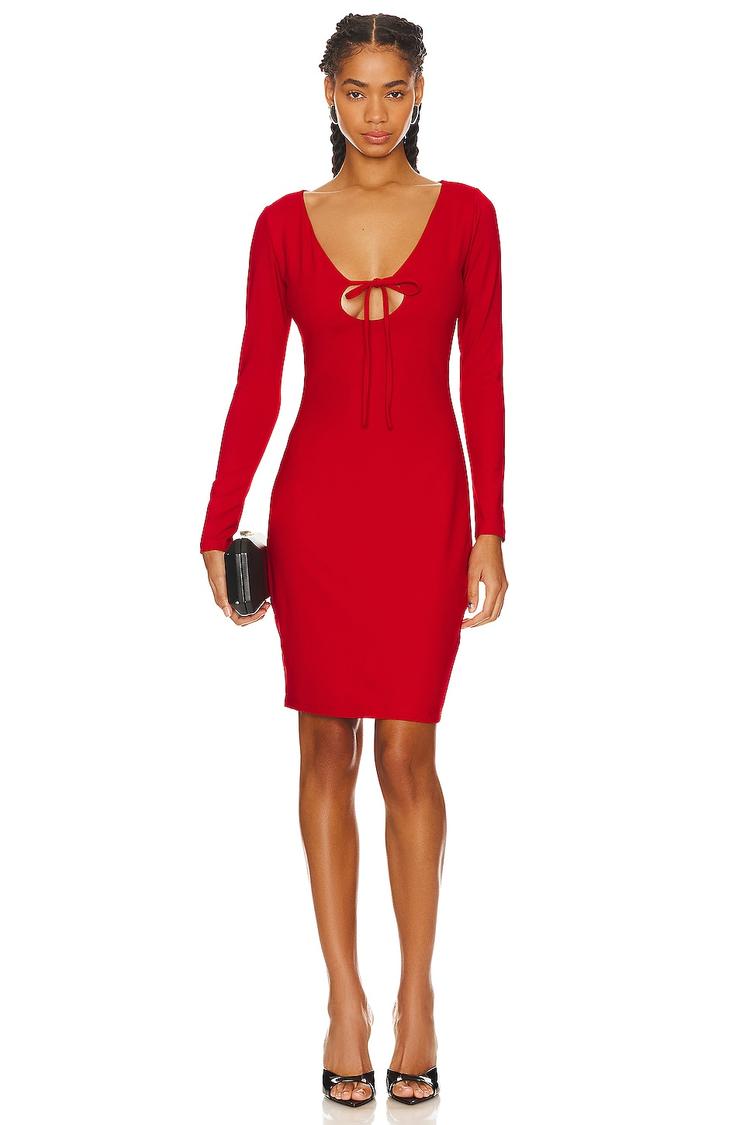 A sleek red sheath dress in a stretchy midweight nylon-spandex jersey fabric offers a figure-hugging fit with long sleeves and a knee-length hem. The standout front cut-out with a tied bow detail adds a flirty, modern touch to the classic V-neck silhouette. Designed for versatile wear, this chic piece transitions effortlessly from date nights and cocktail parties to vibrant evening outings. Its clean hemline and covered back complete the polished look, making it an essential addition for stylish, confident moments.