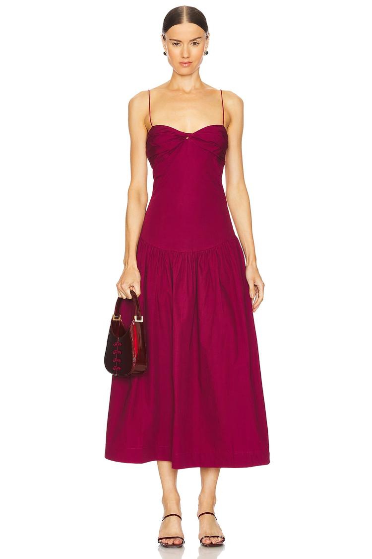 A fitted midi dress in a rich matte burgundy cotton poplin fabric showcases a classic sweetheart neckline and slender spaghetti straps for a minimalist yet elegant silhouette. The smocked back adds subtle texture and comfort, while the concealed side zipper ensures a smooth fit. The clean hemline and flared skirt create a flattering shape perfect for spring and summer occasions such as brunch, date nights, or cocktail events. Lightweight and unlined, this versatile dress balances sophistication with breathable comfort.