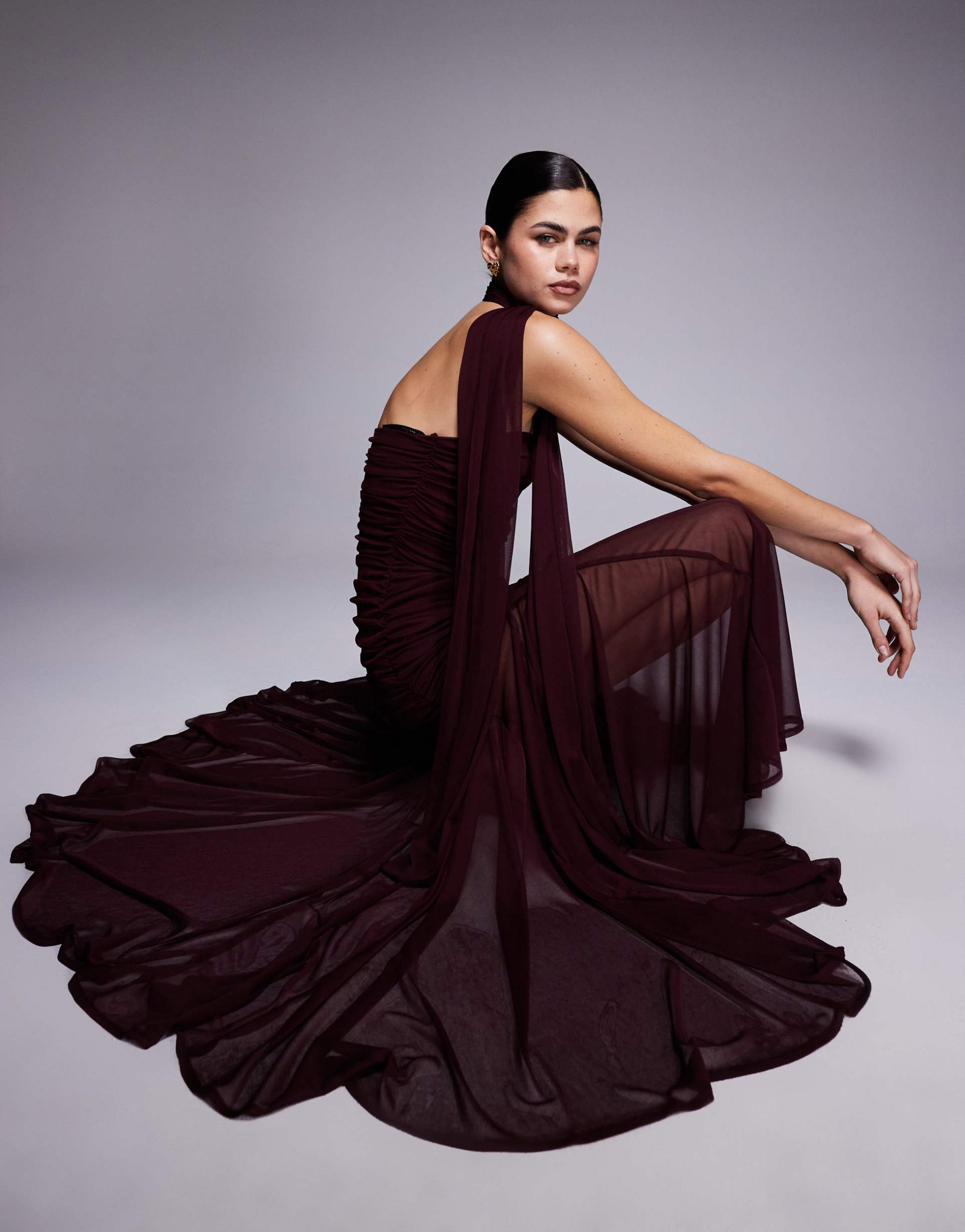 TFNC BANDEAU MAXI DRESS WITH FULL SHEER SKIRT WITH SCARF DETAIL IN DEEP PURPLE