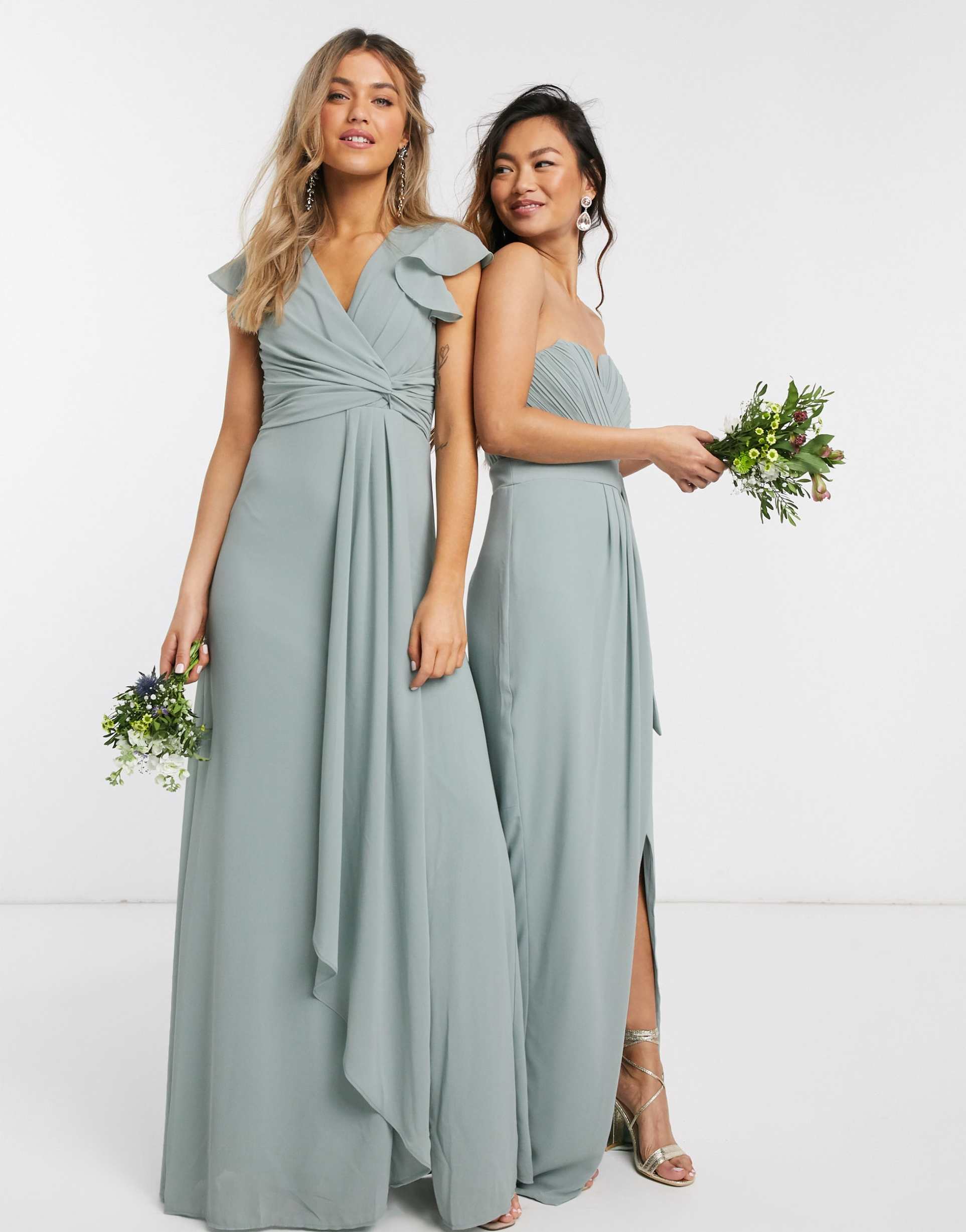 TFNC BRIDESMAID FLUTTER SLEEVE RUFFLE DETAIL MAXI DRESS IN SAGE
