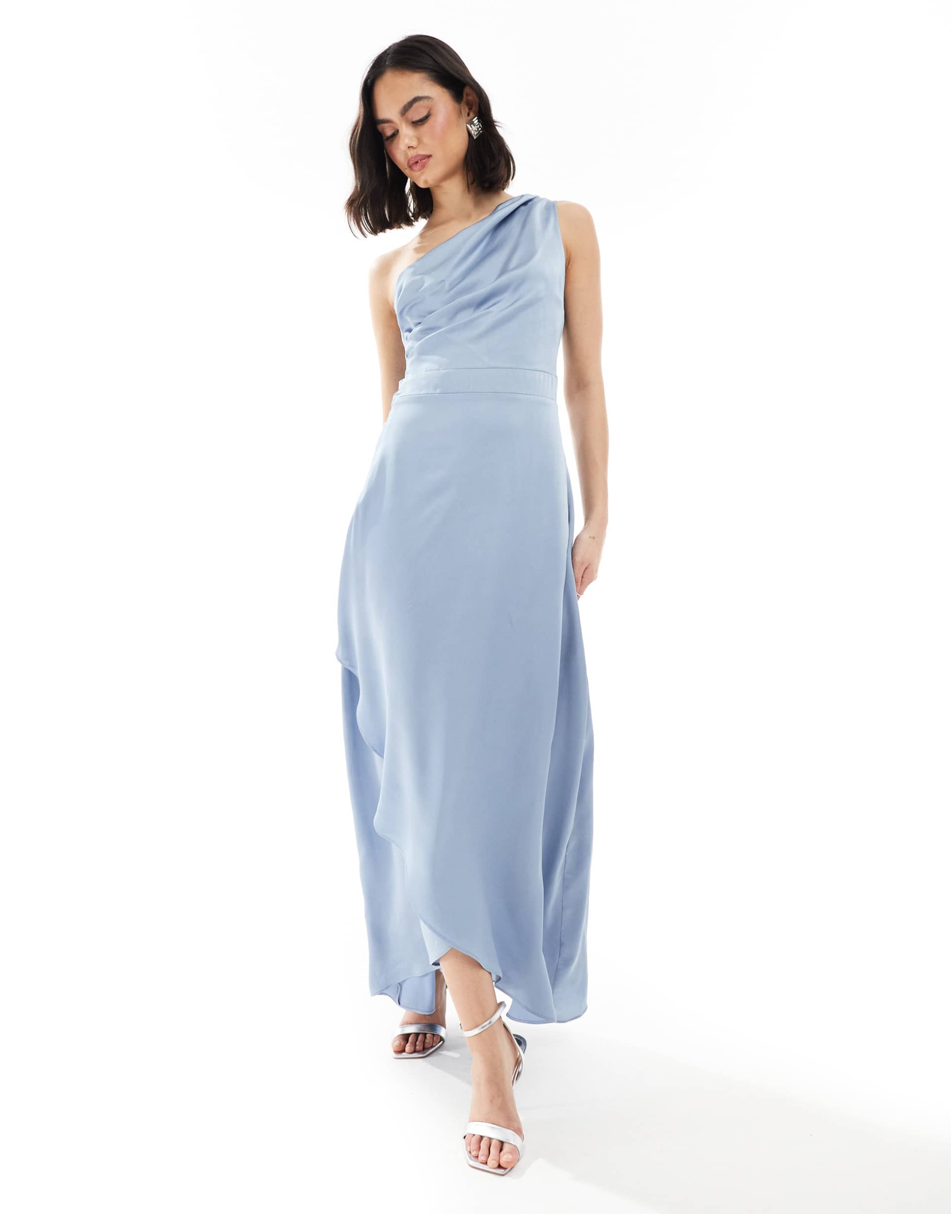 TFNC BRIDESMAID ONE SHOULDER SATIN MAXI DRESS WITH WRAP SKIRT IN DUSTY BLUE