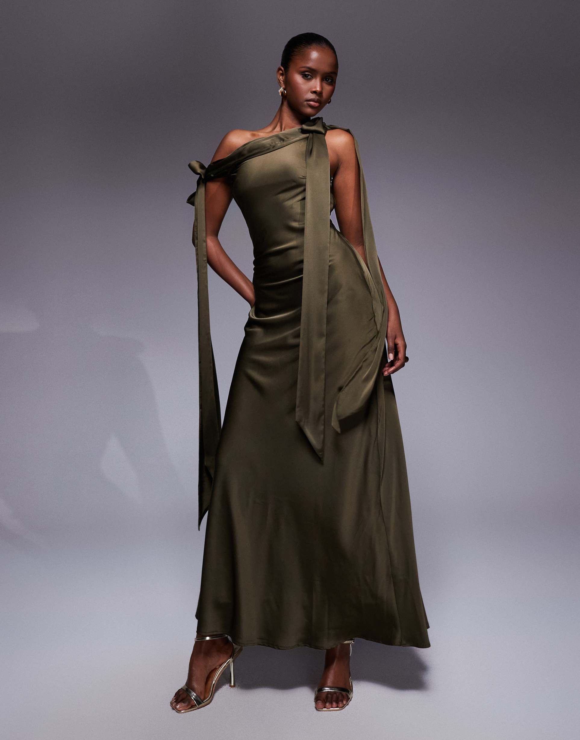 Glossy olive satin fabric and an elegant A-line silhouette define this maxi dress, featuring an asymmetric neckline with a fallen shoulder style. The regular fit skims the body gracefully, while striking tie details and front bows add a sophisticated touch. Sleeveless and floor-length, it drapes beautifully for a refined look. Perfect for formal occasions, cocktail parties, or date nights, this dress combines modern design with timeless elegance.