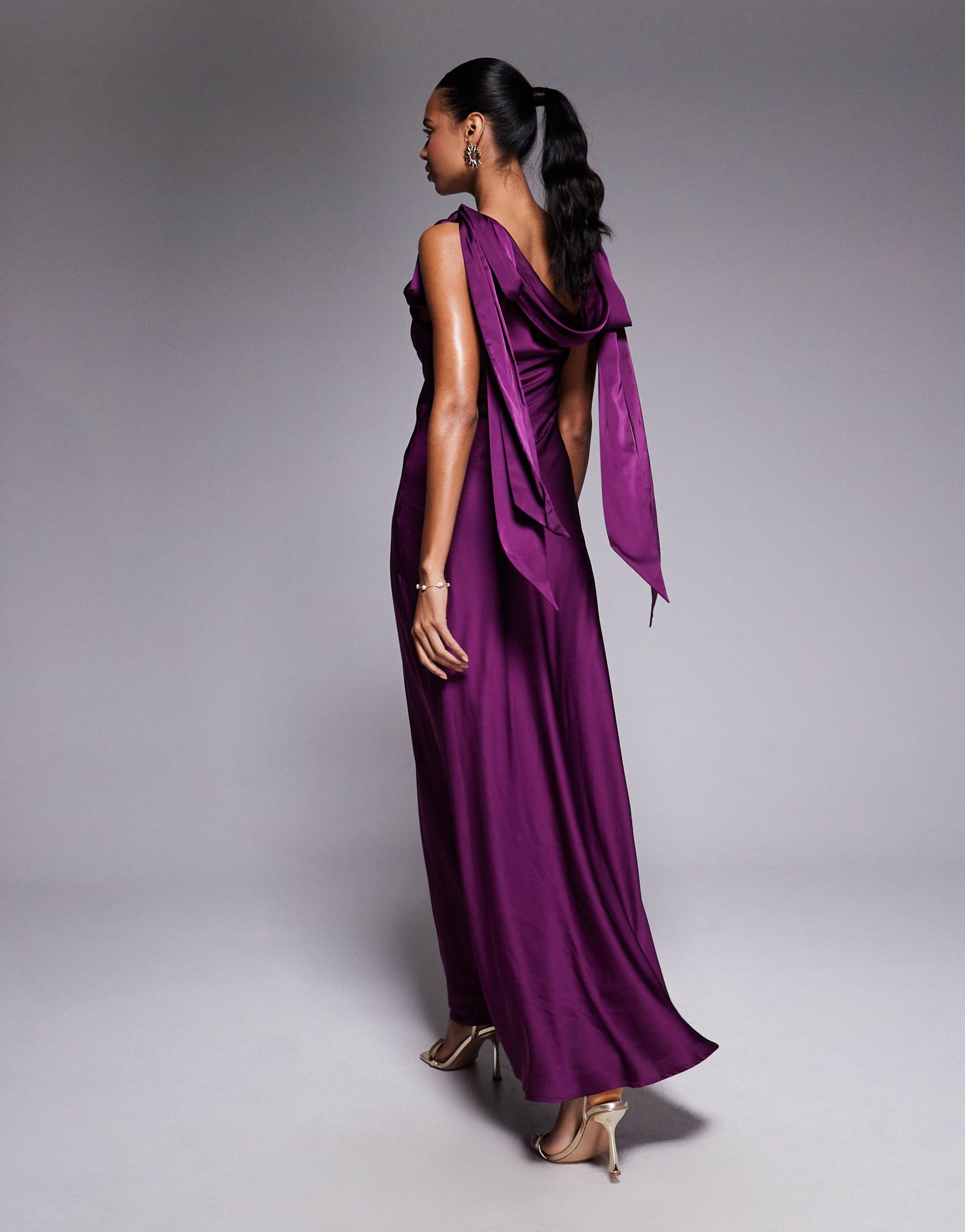 Glossy satin fabric and a sleek column silhouette define this maxi dress, featuring a captivating cowl neckline and back that add refined drape and elegance. The sleeveless, strapless style with tie-fastening shoulder details enhances its sophisticated appeal. A side zipper ensures a smooth fit while the regular cut offers comfort for all-day wear. Ideal for cocktail parties, formal events, and wedding guest occasions, this purple berry gown blends timeless elegance with modern glamour.