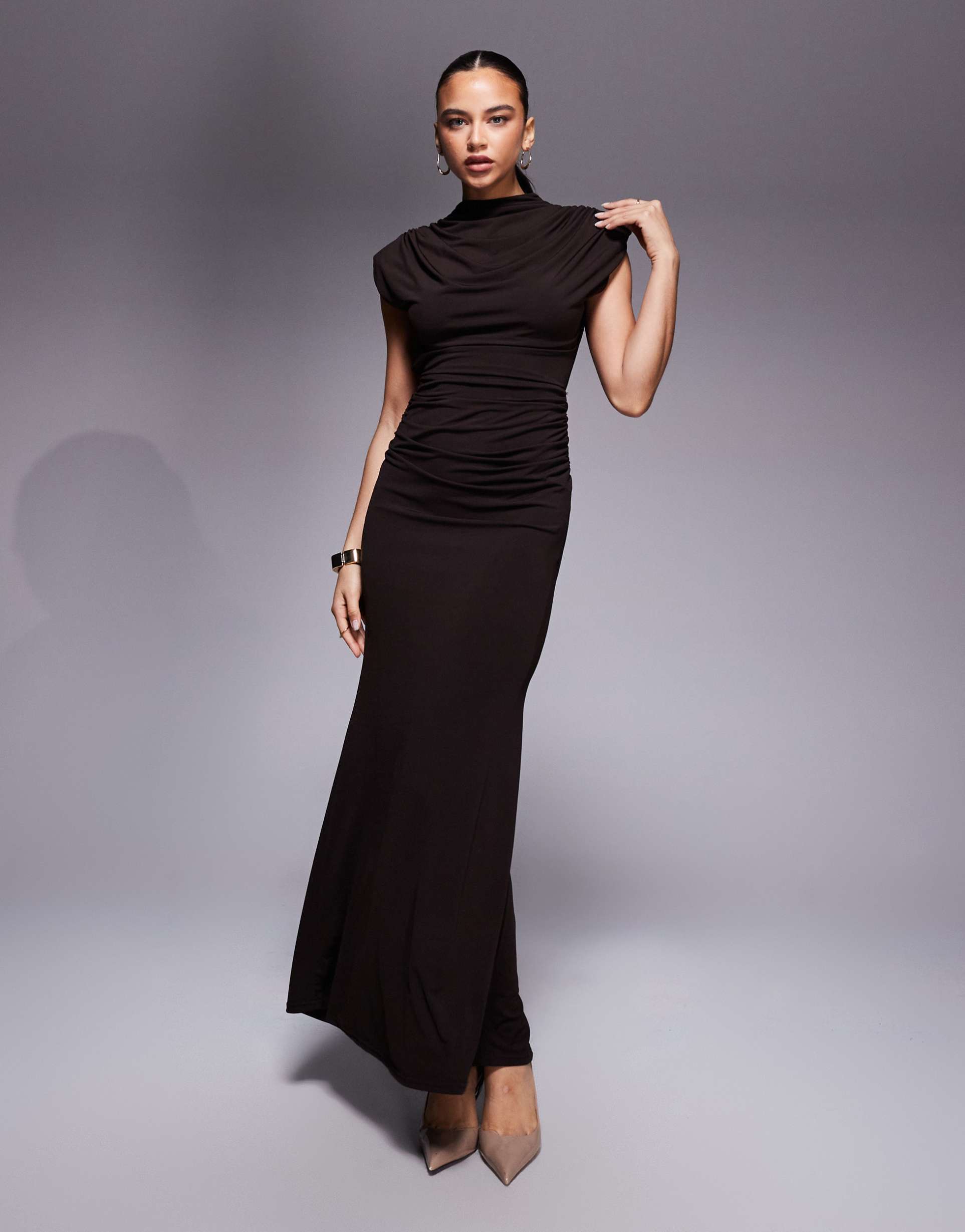 Soft, stretchy jersey fabric forms a slim-fitting column silhouette in a rich matte chocolate hue. This maxi dress features a sophisticated high cowl neck and padded shoulders adding structured elegance. The sleeveless design and draped details at front and back enhance its graceful appeal. An open back with a delicate tie-up closure offers a refined, alluring touch. Perfectly suited for cocktail parties, semi-formal events, and formal occasions, this versatile maxi dress blends comfort with timeless style.