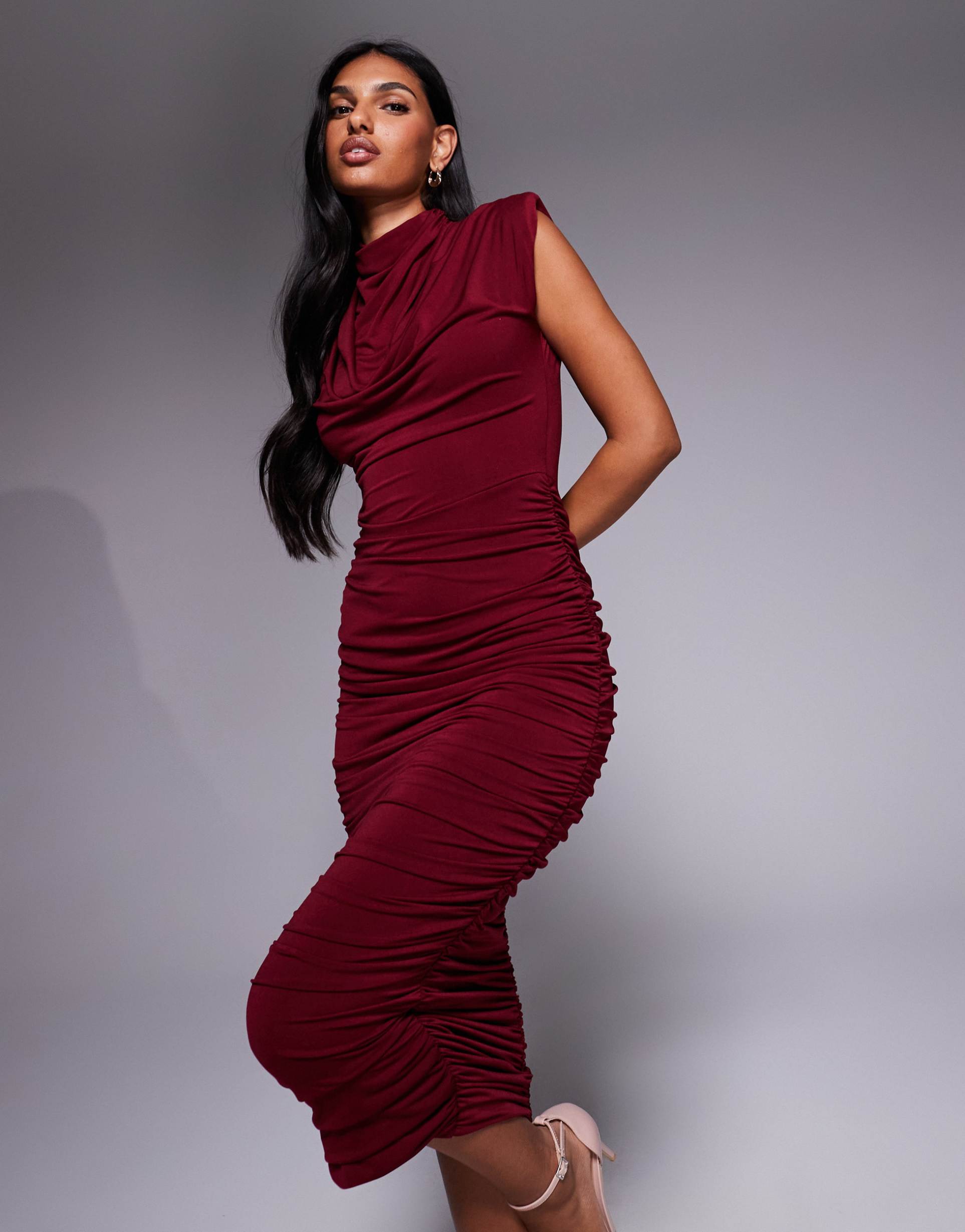 TFNC HIGH NECK PADDED SHOULDER MIDI DRESS IN CHERRY